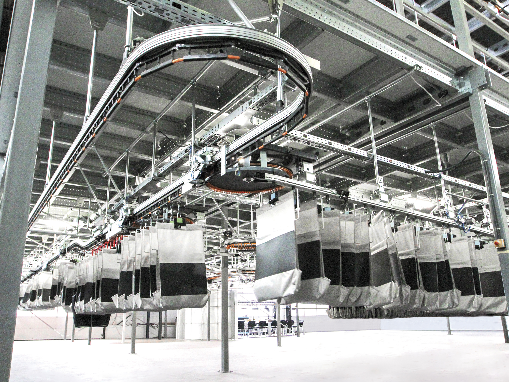 Le système à sacs est la pièce maîtresse du système de traitement de commandes dans le centre logistique. Il s’agit du modèle AIRTRAX Pocket de Vanderlande, qui fut présenté pour la première fois à l'occasion de l’exposition LogiMAT. Ce groupe de pointe puissant convainc entre-autres avec des caractéristiques révolutionnaires :