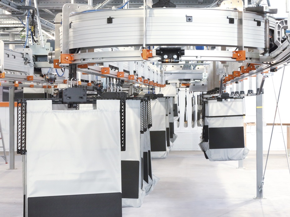 Ces derniers sont commandés via le transpondeur RFID de l’adaptateur de roulement, sur lesquels il est fixé. Le sac même est constitué d'un tissu en polyester, renforcé par un panneau en plastique dans la zone inférieure. Des cadres en plastique spéciaux offrent une fonction améliorée lors du chargement et déchargement, réduisent le volume de l’installation et remplissent les caractéristiques suivantes : Ce sont les cadres qui déterminent la forme des sacs, et à travers le levage du cadre au niveau des stations de remise et d’emballage, une grande ouverture d’injection est créée.